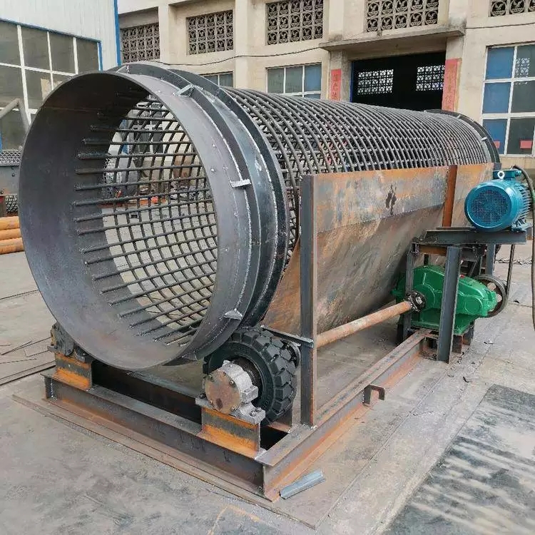滾筒篩主要有電機、減速機、滾筒裝置、機架、密封蓋、進出料口組成。滾筒裝置傾斜安裝于機架上。電動機經減速機與滾筒裝置通過聯軸器連接在一起,驅動滾筒裝置繞其軸線轉動。當物料進入滾筒裝置后,由于滾筒裝置的傾斜與轉動,使篩面上的物料翻轉與滾動,使合格物料經滾筒后端底部的出料口排出,不合格的物料經滾筒尾部的排料口排出。